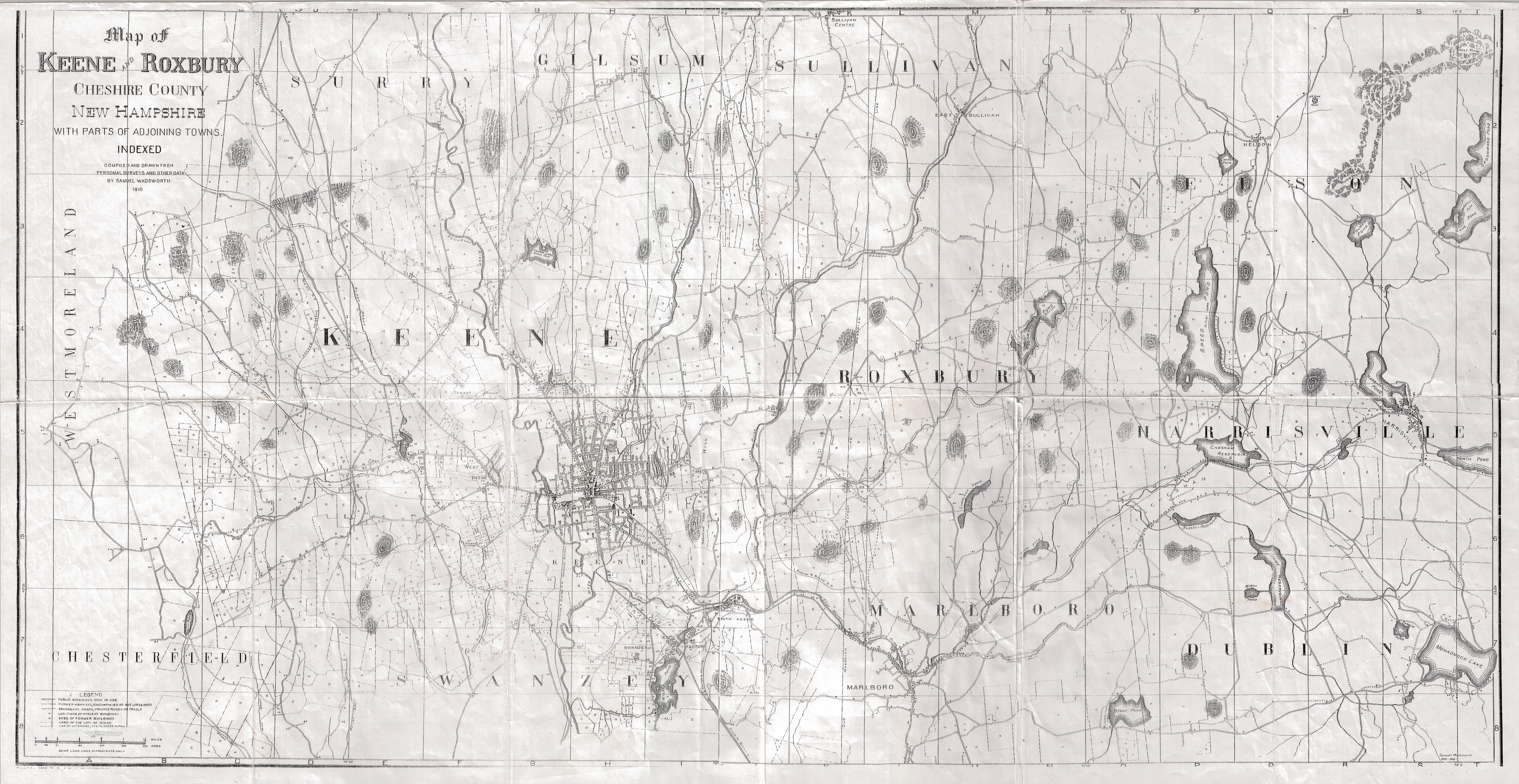 For the last several years, I have been hiking long distances across the Monadnock Region of NH, utilizing historical maps of the area.  No individual has been more instrumental to my route-finding than Samuel Wadsworth (a Keene jeweler, surveyor, and local historian), whose maps were drawn and annotated with exquisite detail.   A full scan of his keyed map of Keene and Roxbury with Historical notes is available at this link (large file will open/download slowly).